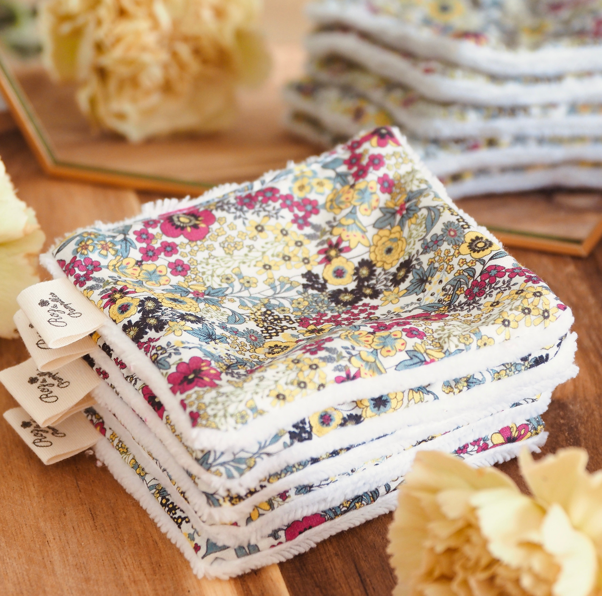Apportez une touche de charme à votre salle de bain avec ces carrés de coton démaquillants. Des créations cousues main en éponge bambou et tissu fleuri, pour allier douceur et élégance naturelle.