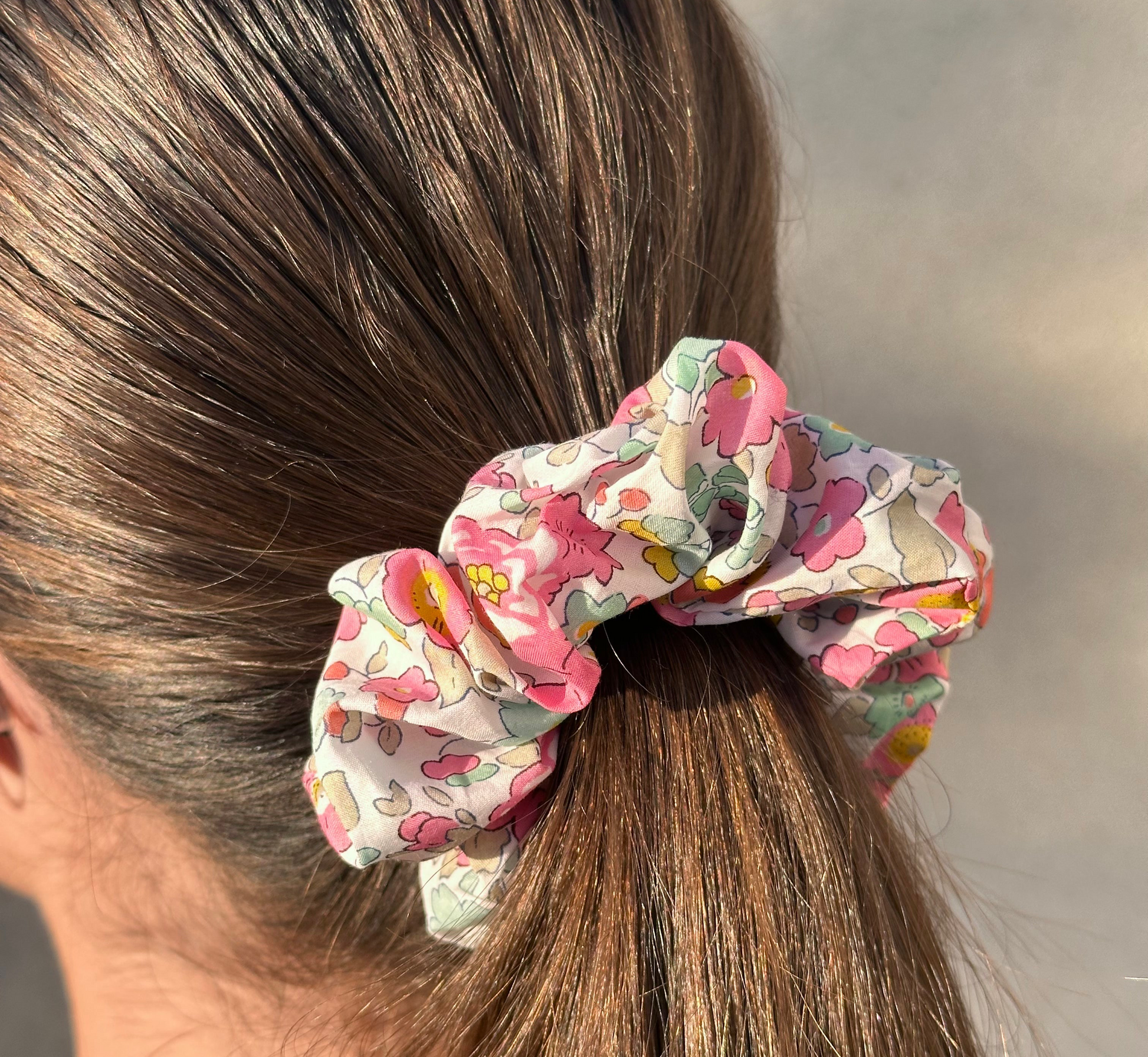 Illuminez votre coiffure avec ce chouchou en tissu fleuri soigneusement sélectionné qui révèle des motifs délicats rose et vert évoquant la douceur et les beaux jours. Parfait pour sublimer une queue-de-cheval, un chignon flou ou simplement habiller le poignet.