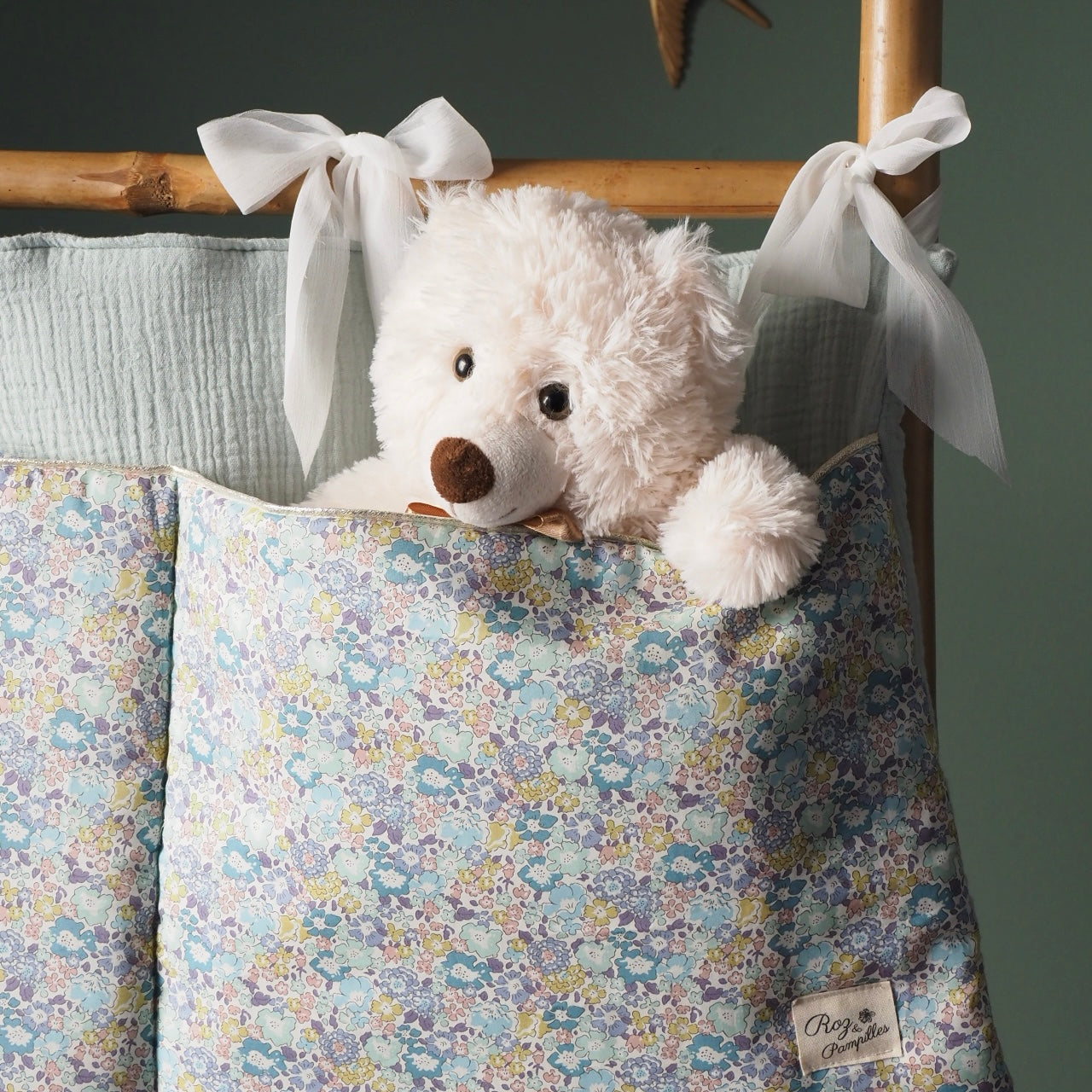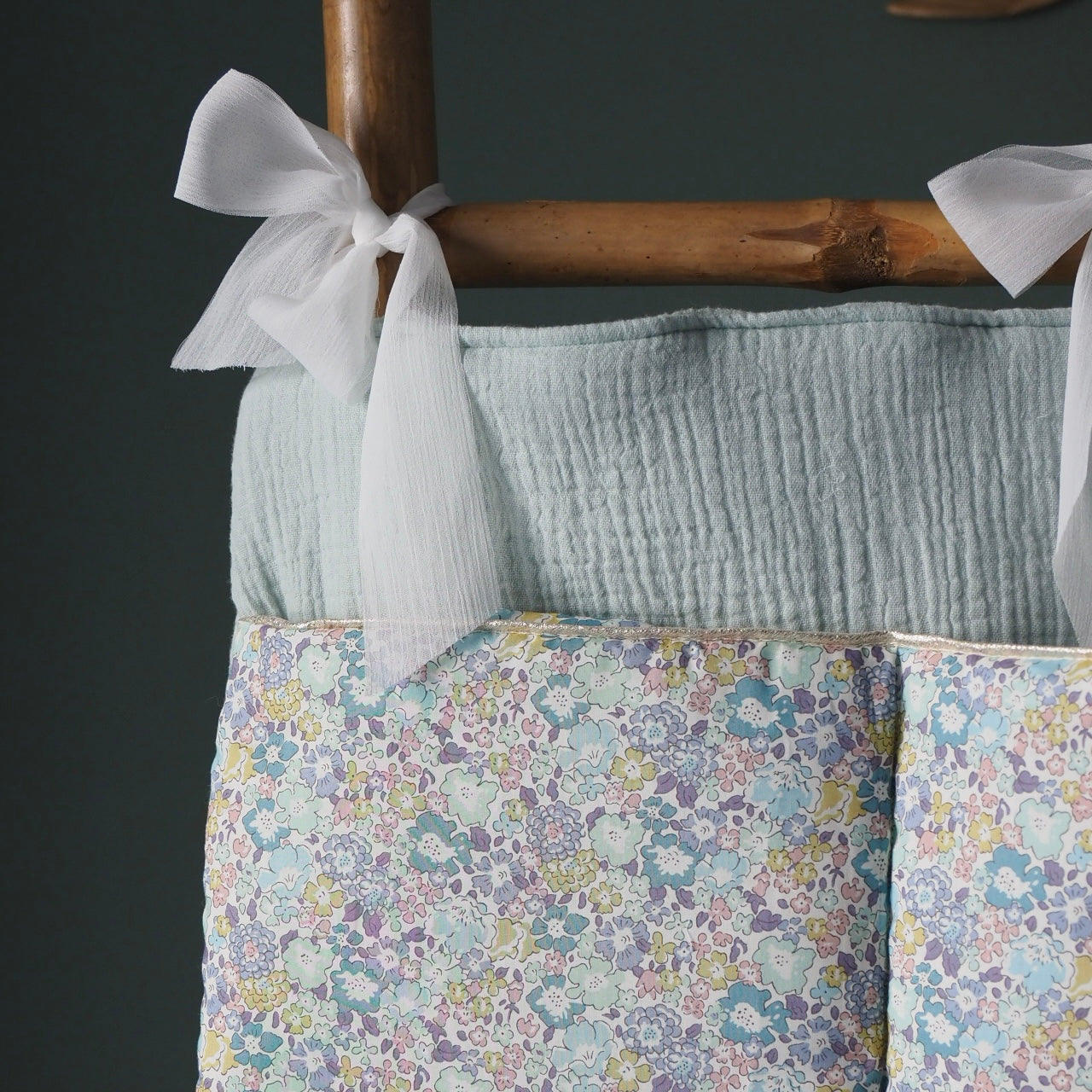 Douce et raffinée, cette pochette range-doudou d’un vert tendre allie poésie et praticité pour embellir la chambre de bébé. Confectionnée à la main dans un délicat mélange de tissu fleuri et de double gaze de coton, elle séduit par son charme intemporel et sa texture toute douce. Grâce à ses liens à nouer, elle s’accroche facilement au lit ou à une tringle. Son format idéal permet d’y glisser les essentiels du coucher tout en apportant une jolie touche décorative à l’espace.