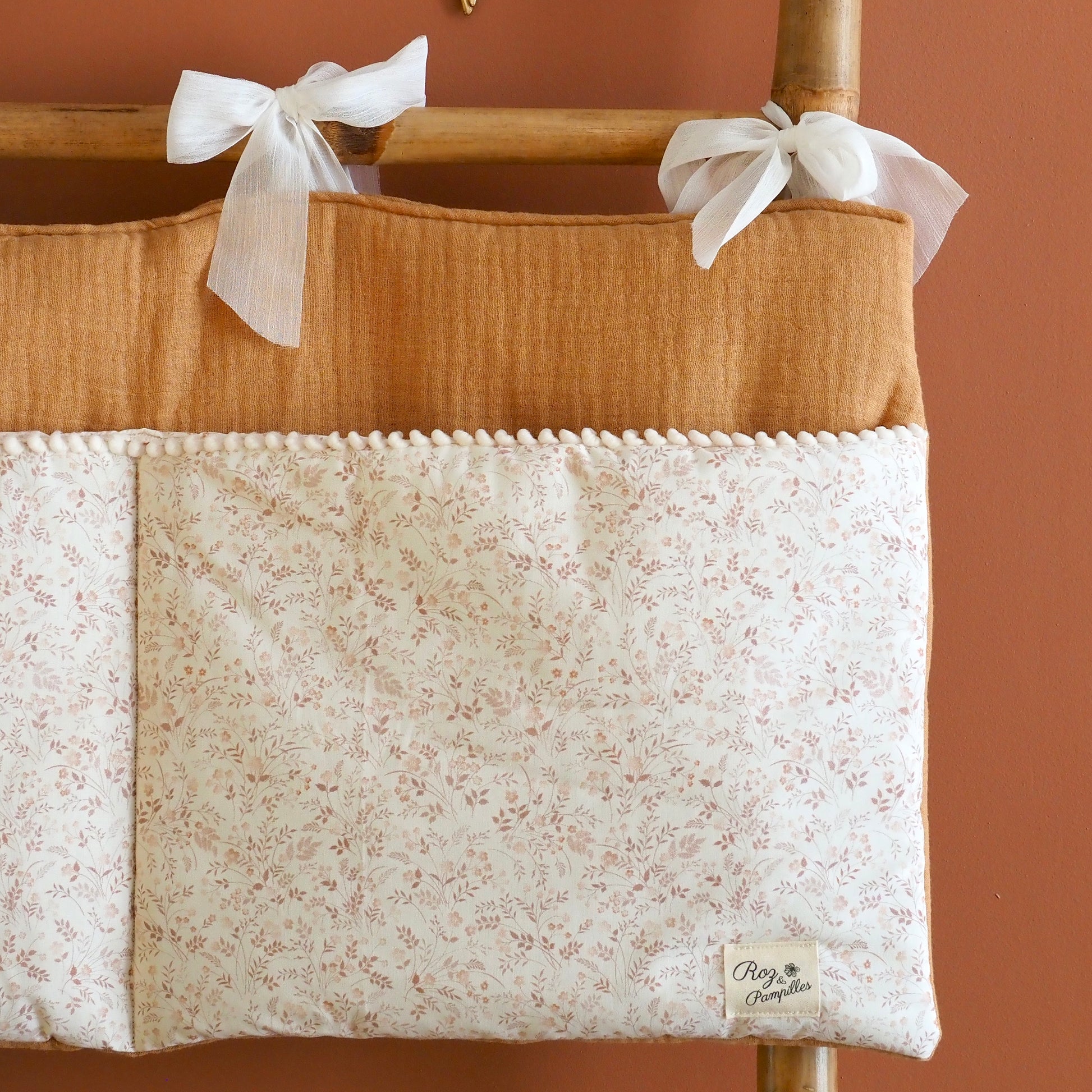 Succombez au charme de cette pochette range-doudou au style délicatement romantique, confectionnée dans un tissu fleuri associé à une double gaze de coton camel toute douce. Ce duo de matières apporte une touche de poésie et de tendresse à la chambre de bébé. Pratique et décorative, cette pochette se suspend facilement au lit ou à une tringle, pour garder doudous, tétines et petits trésors toujours à portée de main.