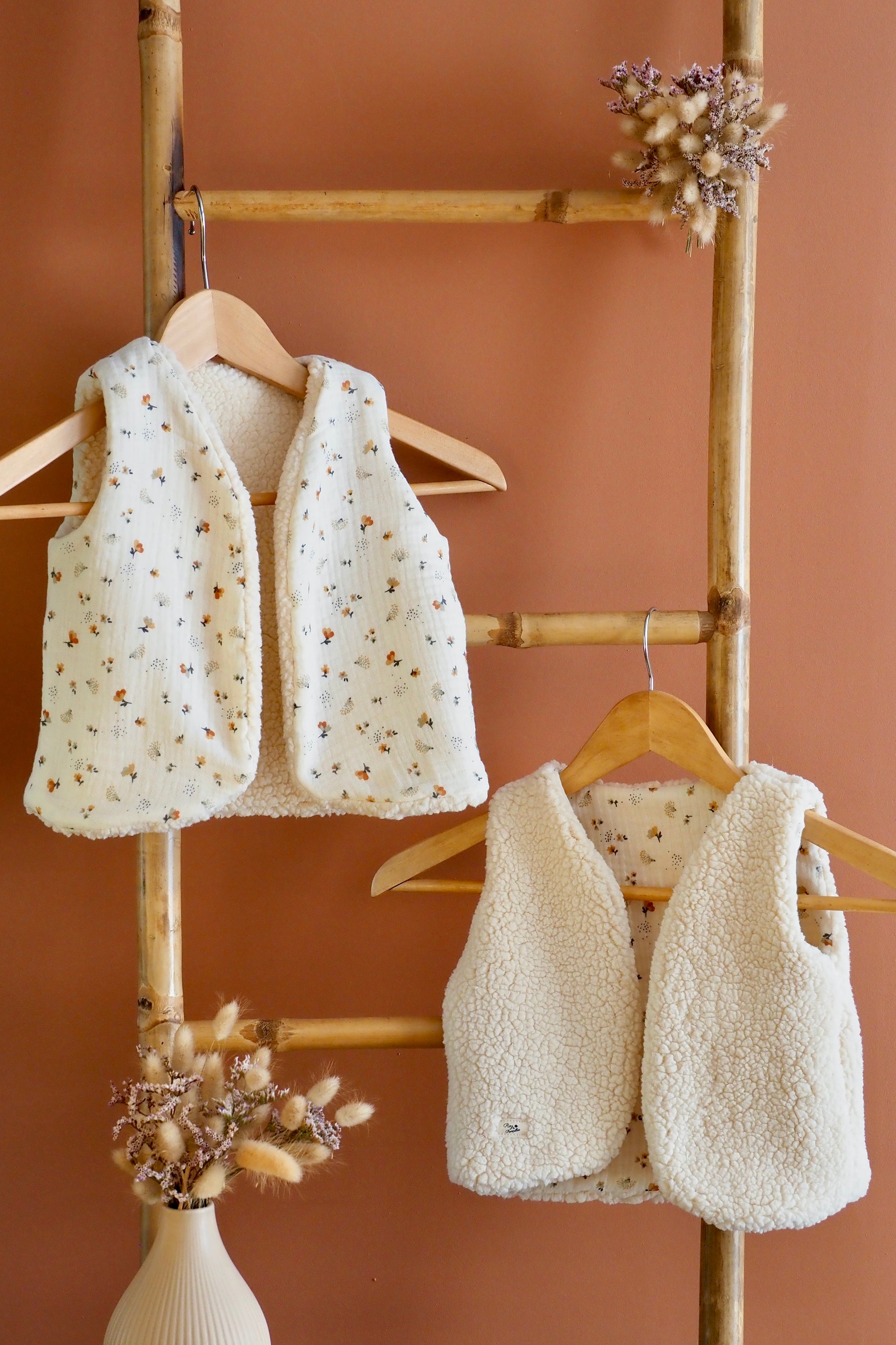 Craquez pour le charme bohème de ce gilet de berger réversible, alliant la douceur de ce sherpa écru à la délicatesse de cette double gaze fleurie au ton automnal. Un cocon de tendresse et de style pour réchauffer les tenues de chaque petit.